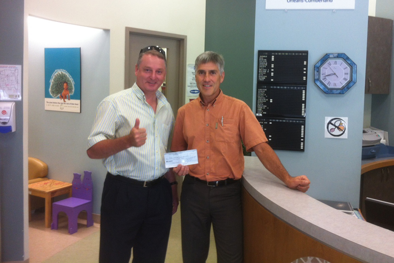 Sean Crossan, President, CCCA presented Luc Ouellette, Executive Director, Orleans-Cumberland Community Resource Centre with a cheque for $500 as a result of over $2,000 of product donated to the CCCA by Laporte’s Flower and Nursery. One good turn deserves another.