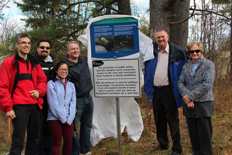 Councilor Bob Monette along with the Cardinal Creek Community Association (CCCA) unveiled the Cardinal Creek Karst sign, during the second CCCA participation in the Carleton University Annual Geoheritage day event.